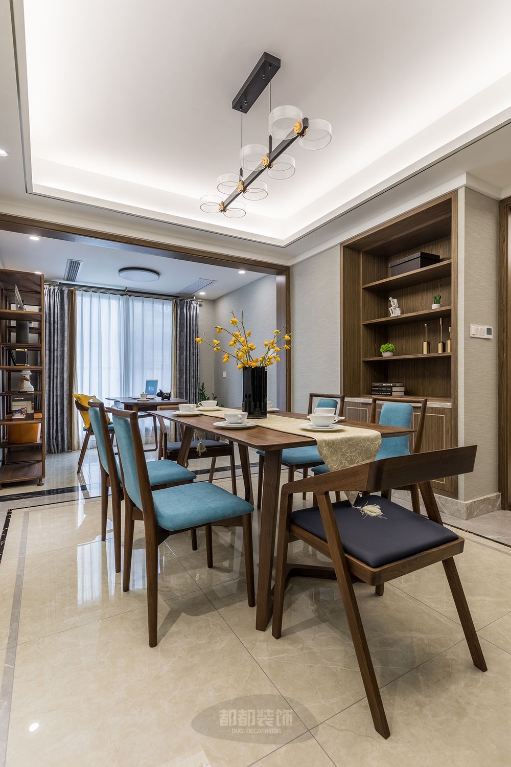 ▲ 新中式的线条感极为利落,工作区的储物柜舍弃传统的笨拙柜子,换以展示功能兼具的木质立柜书架,满足了多功能性的追求,又打破先前的沉闷,极具文雅之气。