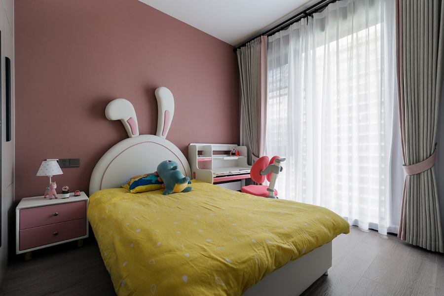 儿童房设计师选用了藕粉色来做墙的底色,但大面积的灰色和木色很好的压下了粉色的甜腻,即使孩子年龄增长也不需要改动,姜黄色床品+兔子床组合,使整个空间变得活泼又童趣。#如何打造安心的儿童房