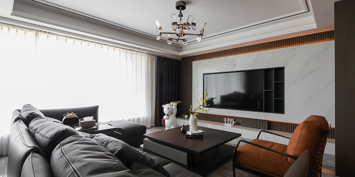 四白落地的墙面、泛着柔润光泽的瓷砖、暗灰色的家具,在考究中显露出一股万物静默如迷的魅力,看似单纯的空间,其实最富有生活的意义。 软装没有花里胡哨的随意堆叠,整体更注重营造出空间的精致氛围,在家具和物品的选择上,以极高的品质传递出愉悦的体验感。 电视背景墙没有做封闭的电视柜,而是在电视右侧加入了开放式的展示架设计,大理石与木格栅碰撞,自然材质、冷暖对比,白色打底使整个空间都明亮通透。 沙发是半包围的摆设布局,除正面的转角沙发外,还摆放了跳跃色单椅,沙发中间搭配精致有型的双层边几,让家居空间更加整齐有序,实用性也大大提高。 客厅除了休闲娱乐,还具有可变性和包容性,可移动的沙发和茶几,不管是“刘畊宏女孩”的健身时刻,还是三五好友的麻将局,亦或是足球之夜、美食派对,随时可以腾出空间做好准备。
