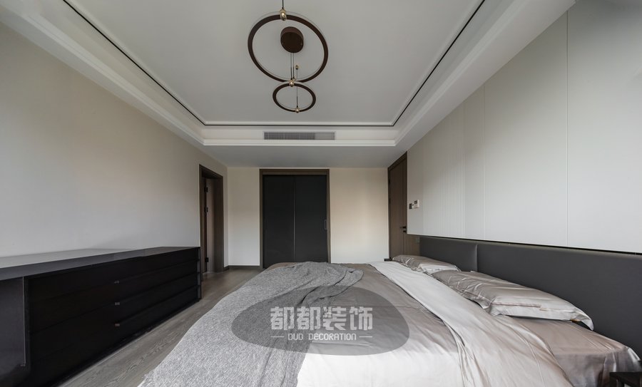 主卧以极致简洁和舒适让身体彻底放松,没有多余之物,静谧雅致,木饰面包裹着白色的墙体,纹路清晰可见,深浅色拼接,没有复杂的风格设计和华丽的色彩。 灰色卧室带来的是优雅、纯净的感觉,丝绸触感的大床颜色和床头柜相呼应,起到了整体协调的效果,床头两侧的圆形吊灯,纤薄时尚的造型诠释了简约即是美的当下审美风潮,对品质的描摹,藏于家中每一个细节中。 衣帽间精心规划出饰品的收纳空间,在传统的柜式收纳上进行创新,实现大容量、功能多、更便捷的储物功能,让物品在此轻松安置,让家居空间更加整齐有序。