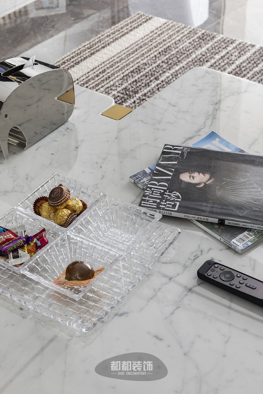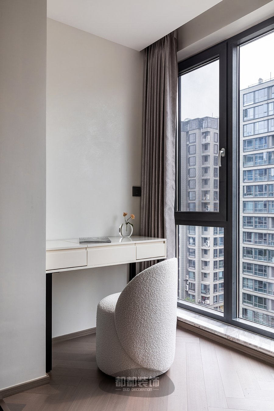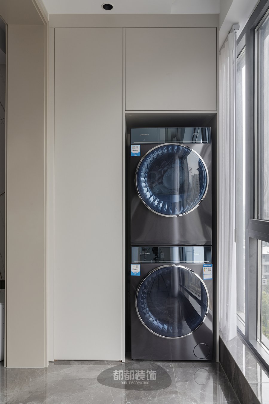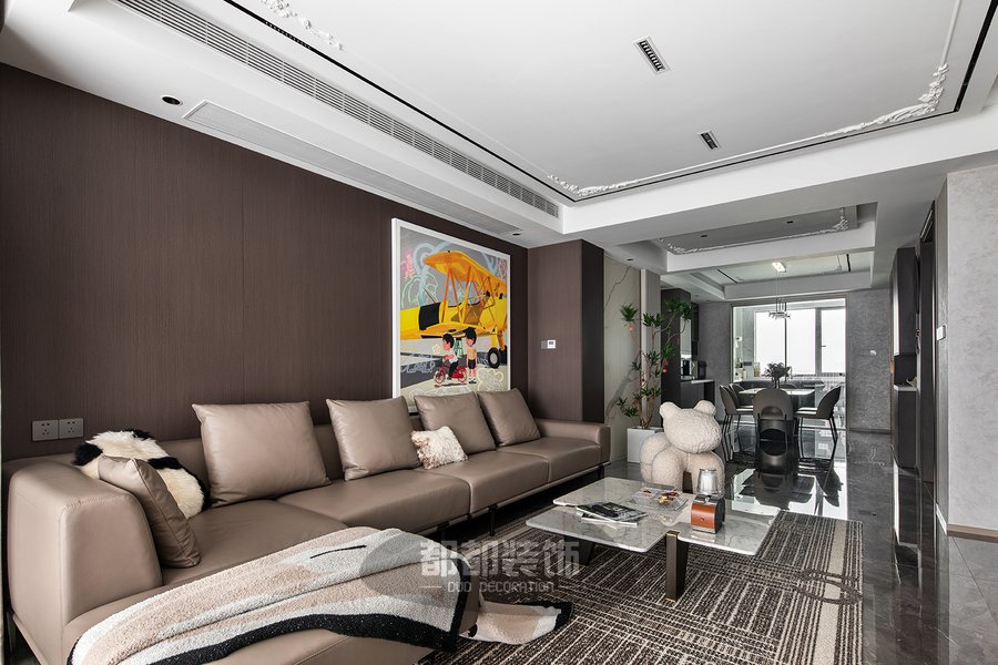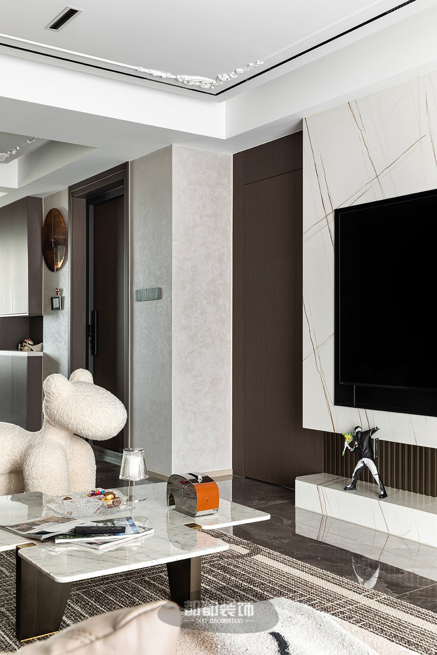 从客厅的落地窗望去白天可远看风景,为空间增添了绿意,客厅设计采用巧克力棕+雪花白的配色、硬朗的空间线条,勾勒出整个客厅空间优雅质感的风骨,屋内宁静沉敛,空间开阔明亮,既有和谐的形制色彩,又有独具意境的艺术品活跃其中。 在电视背景墙处,纯白的岩板上勾勒了许多纵横交错的深咖色条纹,搭配同色系木格栅,让人有种扑面而来的自然质朴气息,这也体现了业主作为新时代都市丽人对自然、本真的追求。 电视柜右侧的开放格上放满了不同色彩的潮玩熊,有透明亚克力盒子的保护就能避免灰尘的污染,靓丽的色彩也会保持的更久。 沙发背景墙明净简洁,咖色纹路自然舒展配合浅棕色软皮沙发,整体空间是对眼睛的一次洗礼,轻重相合,浓淡有致。 自带生机与活力标签的亮黄色装饰画,以童真童趣的笔触铺陈,为空间注入天真浪漫的气息, 羊羔毛小马椅双耳设计,可以当扶手也可以做护栏,圆润可爱的造型一眼就爱上。 阳台门打通后整个视野都开阔了不少,从客厅通铺到阳台的灰色大理石瓷砖,耐脏好打理,阳台装的是可折叠的全景窗,可开可关视觉感超棒,洗漱台洁白纯净,烘干机上墙空间更整洁。