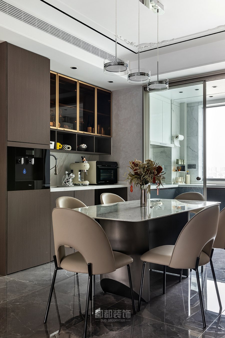 餐厅吊顶延续了客厅法式立体石膏线装修设计,空间也是一贯的摩登棕色调,干净明快,圆角的岩板餐桌和软包餐椅磨平了空间棱角,让美感和功能性得到了融合。 靠墙处定制了茶色玻璃餐边柜,除了放常用的餐具和小电器,也可以用于展示手办和各种潮趣玩偶,能够巧妙地将单调枯燥的平面,幻化为丰富立体的视觉艺术。
