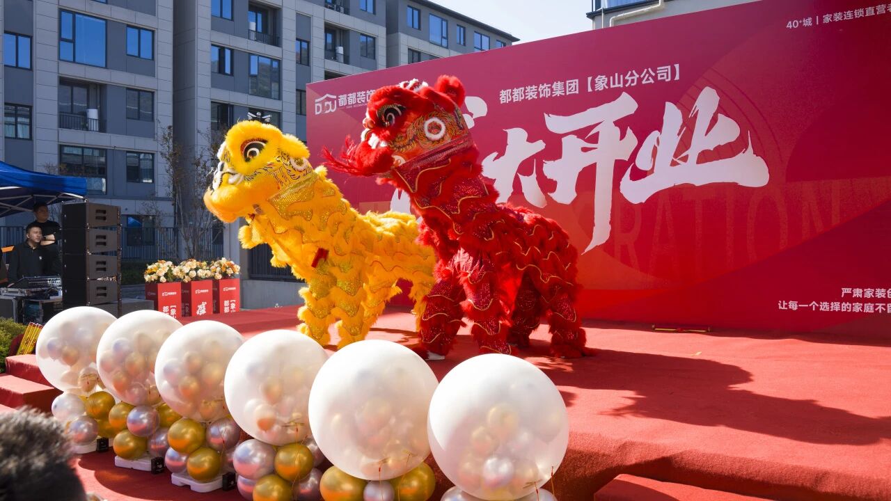 锣鼓喧天,祥狮欢腾,随着一金一红两只雄狮灵动上台,开业现场的气氛达到高潮。在众人的瞩目下,供应链中心总监都天义、象山店总陈文笔一同为祥狮点睛,共同开启都都装饰象山分公司的光明前程!