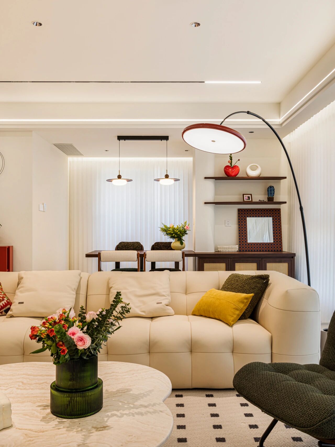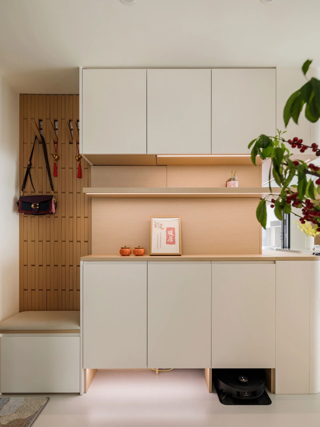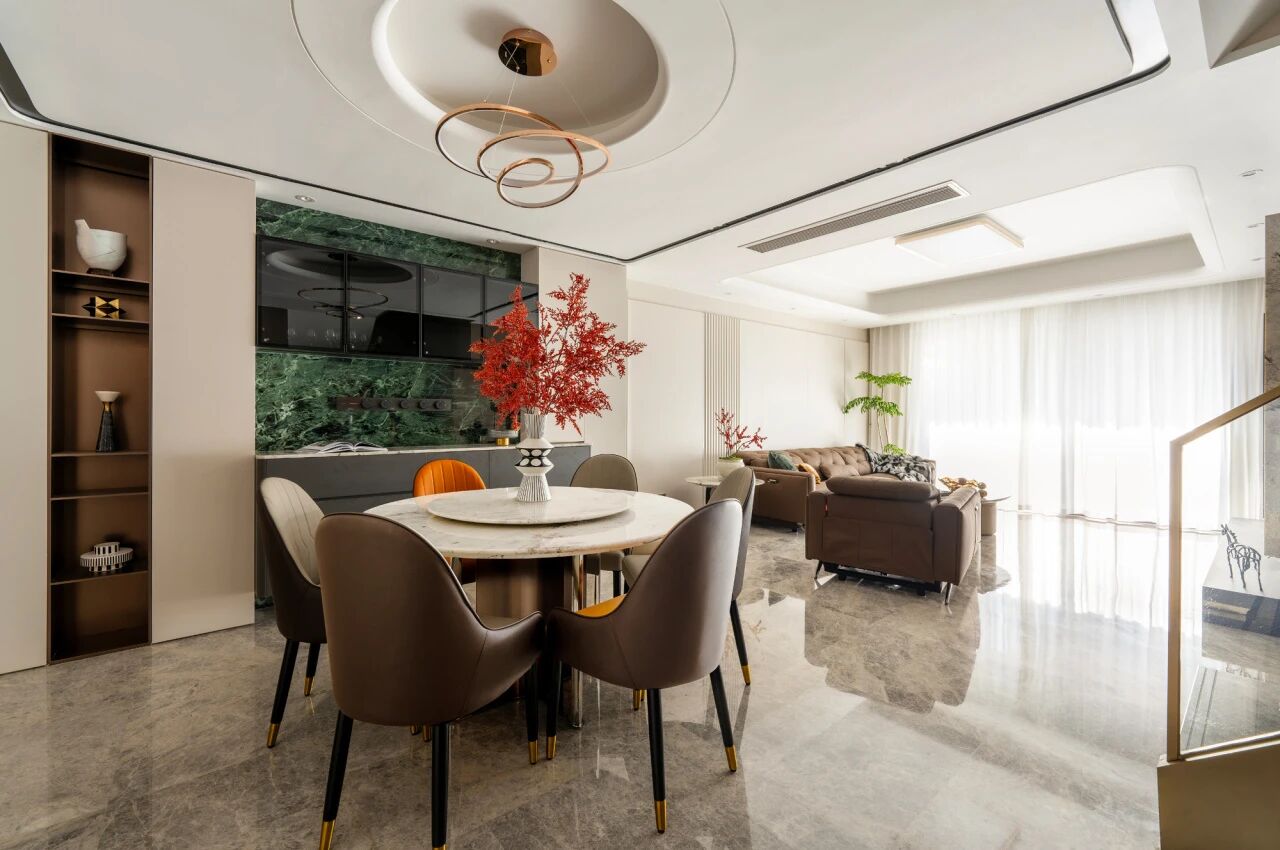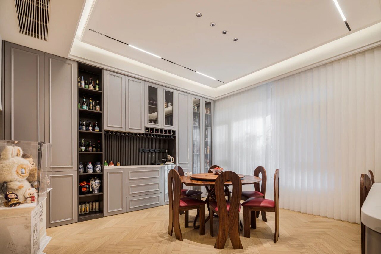 如果家里的玄关和餐厅联通,也可以将餐边柜和玄关柜结合在一起做,进门即获得丝滑的空间切换效果。 在下面这个案例中,利用墙体的拐角做延伸式转角柜,边角处做弧面柔化处理,空间利用率更高,整体的视觉效果看上去也更流畅。