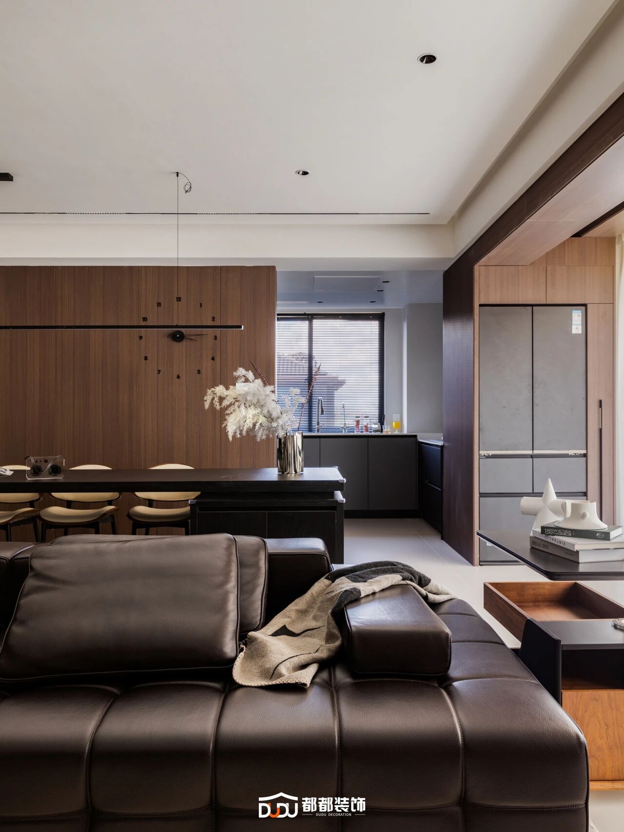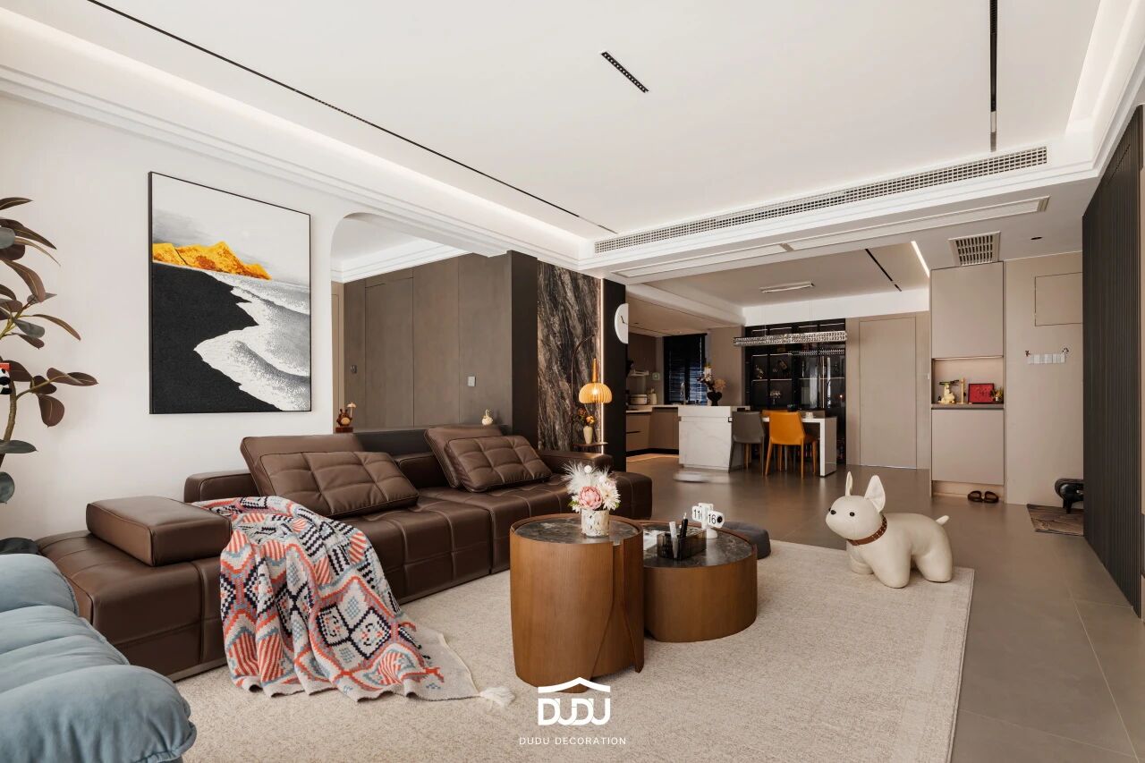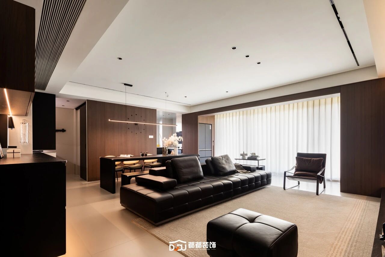 纵深线条的长度往往被刻意拉长,针对现代商品房有限的层高,在实际的落地过程中,我们会通过通顶的柜体或加高的门洞来强化这一效果,营造空间的挺拔感与向上延伸的气势。