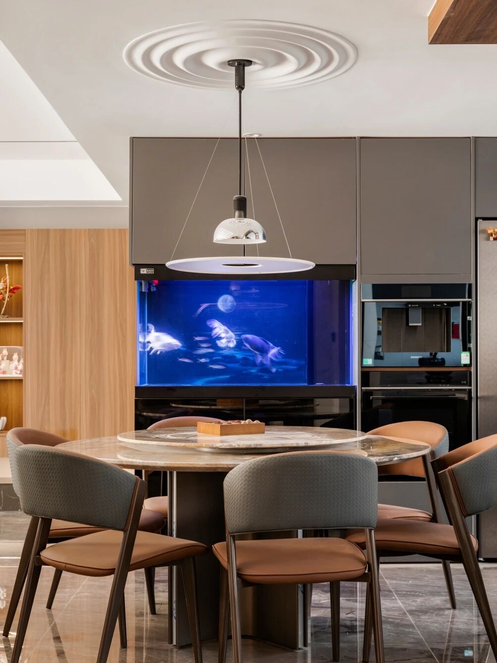 根据鱼缸尺寸提前预留柜体位置,将水体与造景融入整面墙的收纳系统中,不仅节省空间,更让这一角成为家中天然的视觉焦点。